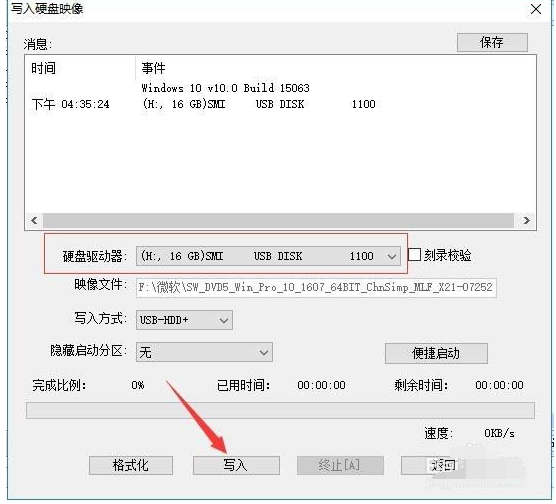 4、在“写入硬盘映像”窗口,硬盘驱动器会选择U盘,点击【写入】。