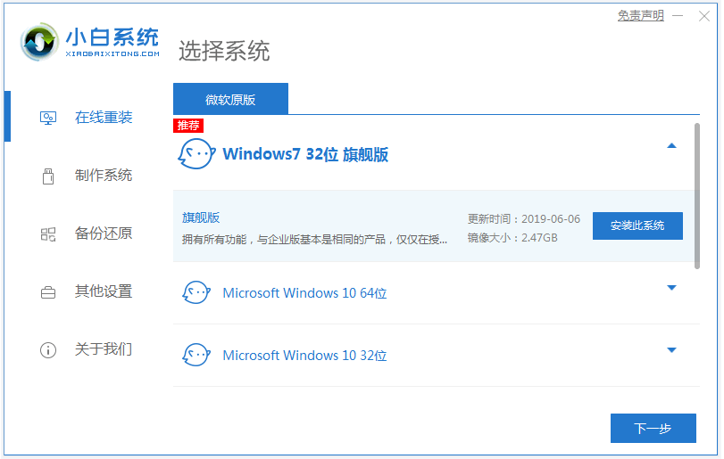这是小编比较推荐的方式,使用小白一键重装系统工具即可在线一键安装原版的win7,无需值守,选好系统后,软件会完成全部安装步骤,操作非常适合电脑新手。具体如下: