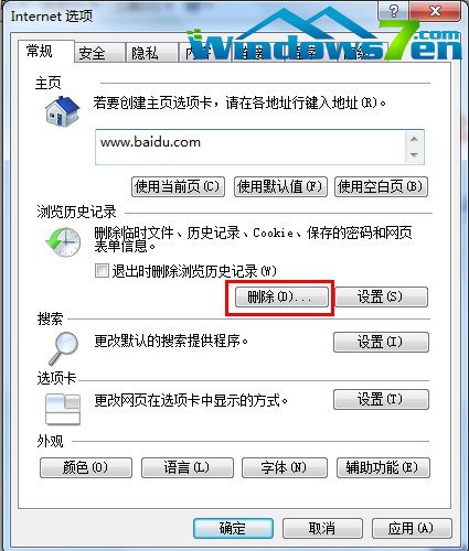 2.Internet选项点开后点击中部位置的"删除"按钮。如(图二)