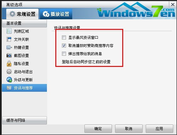 ⒊然后再切换到最下面的“资讯与推荐”设置选项,把“显示暴风资讯窗口”和“弹出推荐给我的消息”勾选去掉。如图二