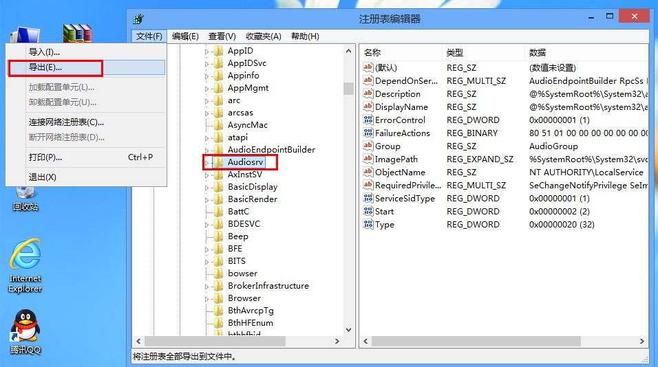 “HKEY_LOCAL_MACHINE\SYSTEM\CurrentControlSet\services\Audiosrv”这个项,点击注册表左上角的“文件”-“导出”进行备份。
