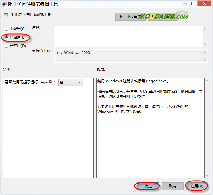 3.在右边双击“阻止访问注册表编辑工具”,把它设置为“启用”这样就可以了。如果你需要安装一些信任软件时,你可以禁用此项,然后再安装。