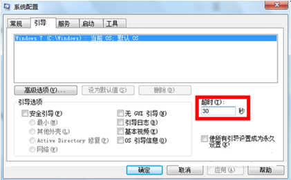 (1) 修改启动设置。依次打开“控制面板→系统和安全→管理工具→系统配置”,再依次选择“启动”标签,将“超时”改为30秒,单击“确定”后重启便可,如图(1)所示: