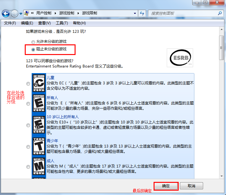 3:如图1-2、1-3、1-4所示,设置游戏分级,并阻止未分级的游戏运行。