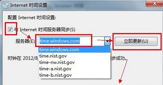 勾选“与Internet 时间服务器同步”选项,然后就能选择你要同步的服务器,这样就能获取到最为准确的时间了!