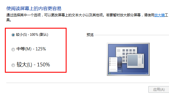 然后会弹出一个“使阅读屏幕上的内容更容易”窗口,在下面分别有较小、中等、较大的字体大小选择,大家可以按照自己的需求对应选择即可!