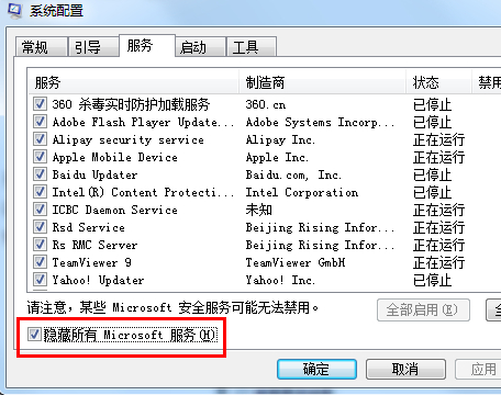 第二步,我们将界面切换到服务选项,然后将下方的隐藏所有microsoft选项勾选上。现在上面的窗口中出现的服务就是真实的电脑中第三方加载项的全部服务项目了,大家可以看看,哪些是不需要的,就将它删除好了。