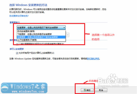 5.选择下拉栏 选择 除了“自动更新(推荐)”以外的其它选项,点击确定