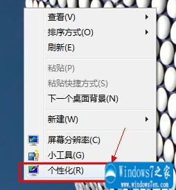 步骤一、在win7桌面任意位置单击鼠标右键,然后从弹出的右键菜单里选择“个性化(R)”。