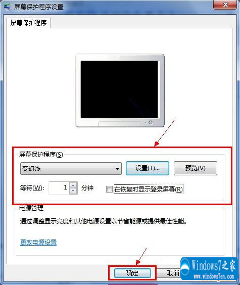 步骤三、在“屏幕保护程序设置”窗口下的“屏幕保护程序(S)”的下拉列表中选择自己喜欢的屏保,可以按“设置(T)...”按钮进行设置,在“等待(W)”后设置电脑闲置多久来启动屏保,如果您需要在屏保停止后需要输入密码才能恢复到桌面,请选择“在恢复时显示登录屏幕(R)”项前的复选框,完成后按“确定”按钮即可。