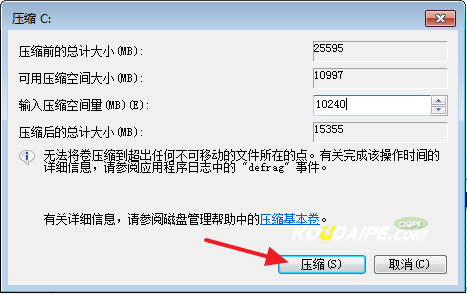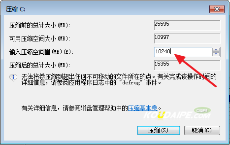 5.在输入压缩空间量(MB)里填写要压缩出的空间量,如果要压缩出10G,就填写10G*1024MB,如图5