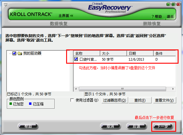 四:OK,找到误删的文件一个,勾选该文件的小方框,随后点击下一步,如图4所示:
