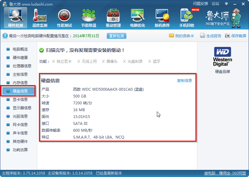 3.安装完毕后→鲁大师自动运行→选中“硬盘信息”→就可以查看硬盘的详细信息,包括产品、大小、转速、缓存等,如图1所示: