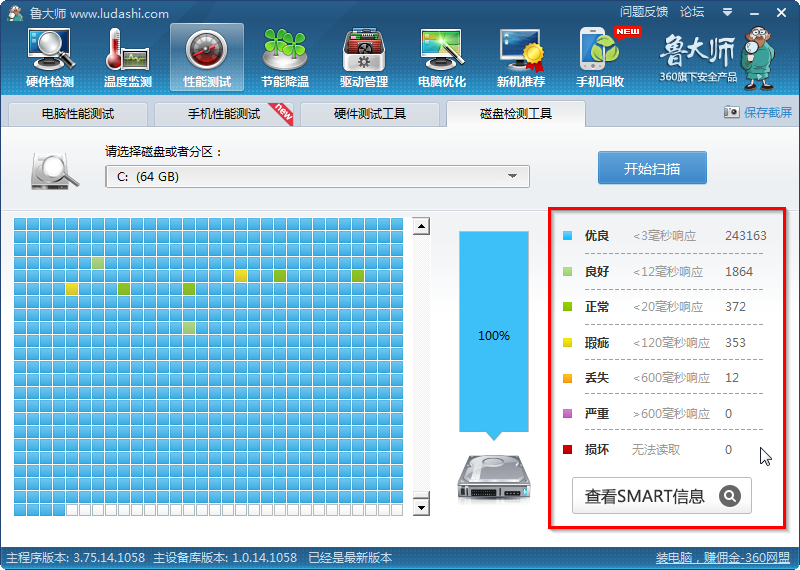四、硬盘性能状态查看(我们同样可以利用鲁大师进行查看)