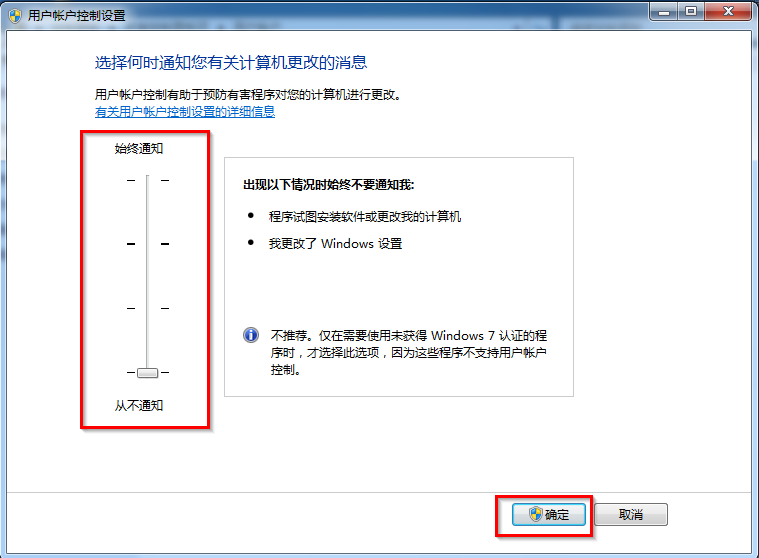 5、在“用户账户控制设置”界面中,会看有一个更改通知的频率。要取消用户账户设置,我们只要把它拉到最底部就行。如图5所示