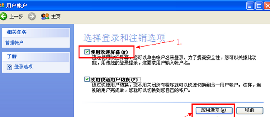4、在出现的“选择登录或注销方式”界面中,勾选“使用欢迎屏幕”,点击“应用选项”即可。