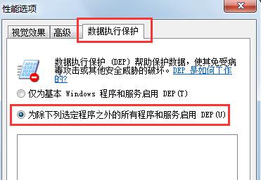 4、在性能选项窗口中,切换到“数据执行保护”,选择“为除下列选定程序之外的所有程序和服务启用”。