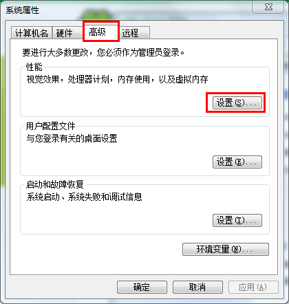 3.此时会跳出系统属性界面,将上方的标签切换到“高级”,点击下方性能里的“设置按钮”