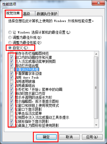 4.弹出性能选项后,我们就可以看到“视觉效果”标签下,系统的外观特效选项了,用户可以根据个人需要来勾选或者取消这些特效,完成后点击“确定”按钮保存退出。