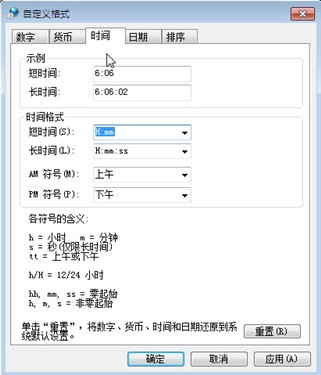 通常情况下我们不喜欢将下午1点称之为13点,所以12小时制似乎更适合大家的日常习惯,那你可以将windows7的系统时钟改成12小时制。操作方法一样简单,首先进入“自定义格式”下的“时间”面板,将原本代表24小时制的“H”替换为代表12小时制的“h”。当然为了能让时间显示更加直观,前面最好还要加入代表上午、下午的“tt”代码,这样就完成了。