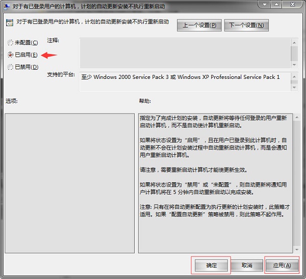4、最后在出现的选项框中点选“已启用”——“应用—确定”键值储存后关闭“组策略编辑器”就可以了。。