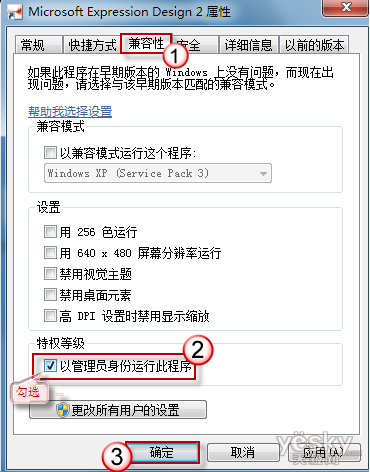 切换到“兼容性”选项卡,在“特权等级”栏,勾选“以管理员身份运行此程序”,然后按“确定”。