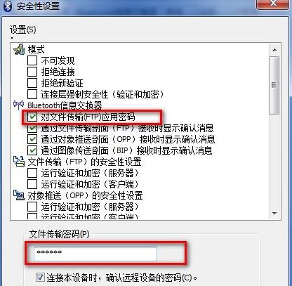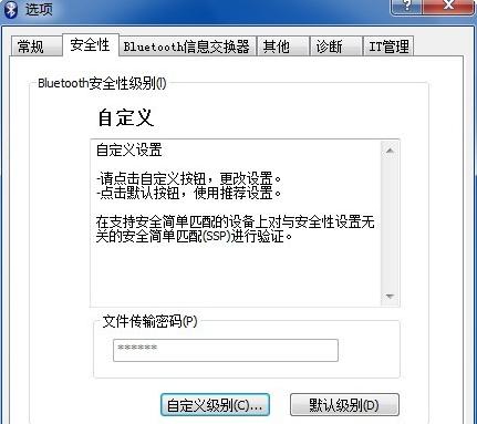 二、接着在蓝牙程序窗口中,选项至“安全性”,然后点击自定级别按钮。即可打开“安全性设置”窗口,在安全性设置窗口中,勾选“对文件传输(FTP)应用密码”,然后在文件传输密码处输入密码。