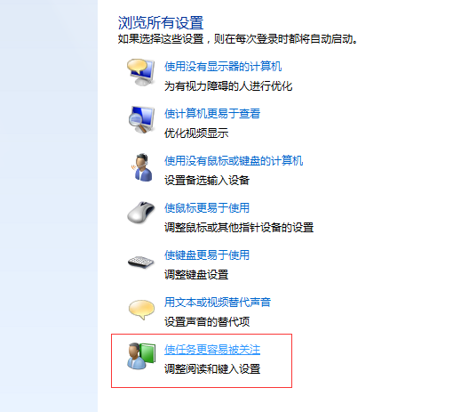 2、按顺序打开“控制面板”→“轻松访问”→“轻松访问中心”→“使任务更容易被关注”;
