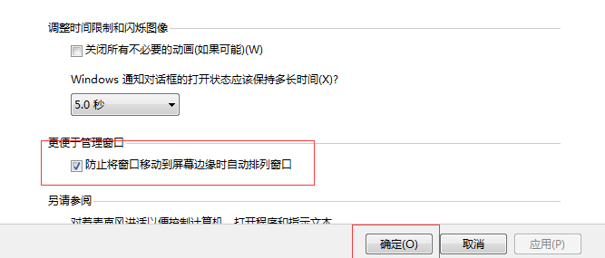 3、勾选打开的界面中的“防止将窗口移动到屏幕边缘时自动排列窗口”前的复选框后点击确定即可;