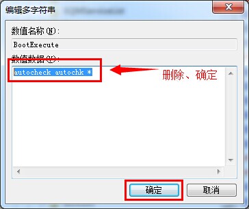 3.最后双击打开BootExecute项,将里面的“autocheck autochk”删除,然后保存。如下图所示: