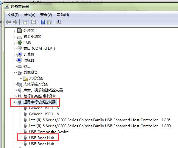 2、接着在弹出的属性窗口中点击左上角的“设备管理器”选项,再点击展开“通用串行总线控制”选项,就会出现很多排“USB Root Hub”设备列表。