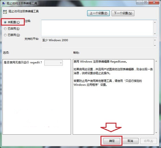 4、最后打开阻止访问注册表编辑工具选项后,阻止访问注册表编辑工具处于“已启用”状态表示注册表访问被阻止,因此无法打开,我们可以选择“未配置”选项,最后点击确定保存当前设置。
