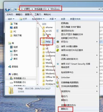 1、首先打开资源管理器,找到“C:\Windows\Help”文件夹,一般是windows的帮助文件,可以删除里面的所有文件,右键点击help文件夹,在出现的右键菜单中选择“删除”选项。