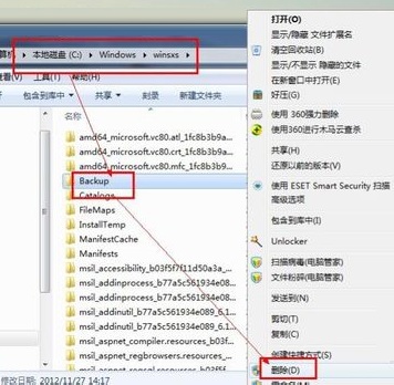 2、接着打开资源管理器,找到“C:\Windows\winsxs\Backup”文件夹,一般是windows的备份文件,可以删除里面的所有文件,右键点击Backup文件夹,在出现的右键菜单中选择“删除”选项。