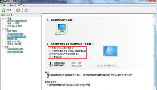 7、之后调节桌面尺寸和位置,如果显示器带自动缩放的功能,那么就可以选择“使用显示器内置缩放功能”选项,但是显示器不带有这样的功能,那么建议大家还是选择“使用NVIDIA缩放功能”选项。