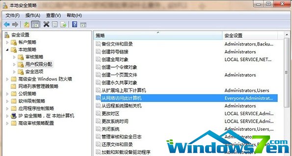2、接着点击“用户权限分配”选项,在右边的策略窗口中找到"从网络访问此计算机"选项 ,打开后把可以访问此计算机的用户或组添加进来。