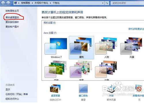 这就是跟Windows XP的变化了,微软直接把更改桌面图标这个选项放到了个性化界面的面板上,其实是更加方便我们找到它,只是大家习惯了以前Windows XP的方式,所以反倒不知道如何修改了。