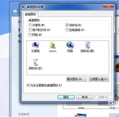 进入桌面图标设置后就可以看到所有桌面默认的图标了,有计算机(原我的电脑),网络,控制面板,用户的文件(原我的文档)。