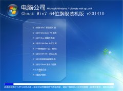 (电脑公司win7旗舰版64位201410秋季版) 源于win7 64位原版基础上进行适当精简和优化的系统,集成最新,最常见的电脑系统软件与win7 64位系统驱动,并且系统干净无毒,按照用户使用习惯作细心设置,在前几个版本的基础上作了重大改善,拥有电脑公司win7旗舰版独有人性化的设计,系统运行稳定、兼容性强!经过几十个技术员为期不少于一周的测试和使用,是您装机之法宝,欢迎下载体验,并留下你宝贵的建议(下方留言)!