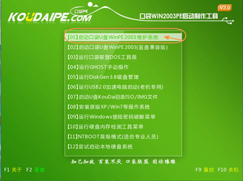 3.重启电脑,进入口袋PE,选择第一项“启动口袋U盘WinOE 2003维护系统”进入。如图二