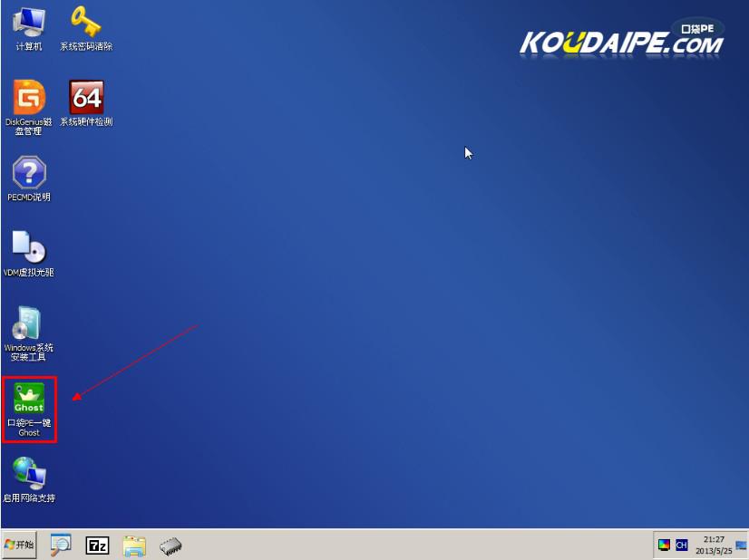 4.进入口袋Win2003系统桌面后双击运行桌面上的口袋PE一键Ghost工具。如图三