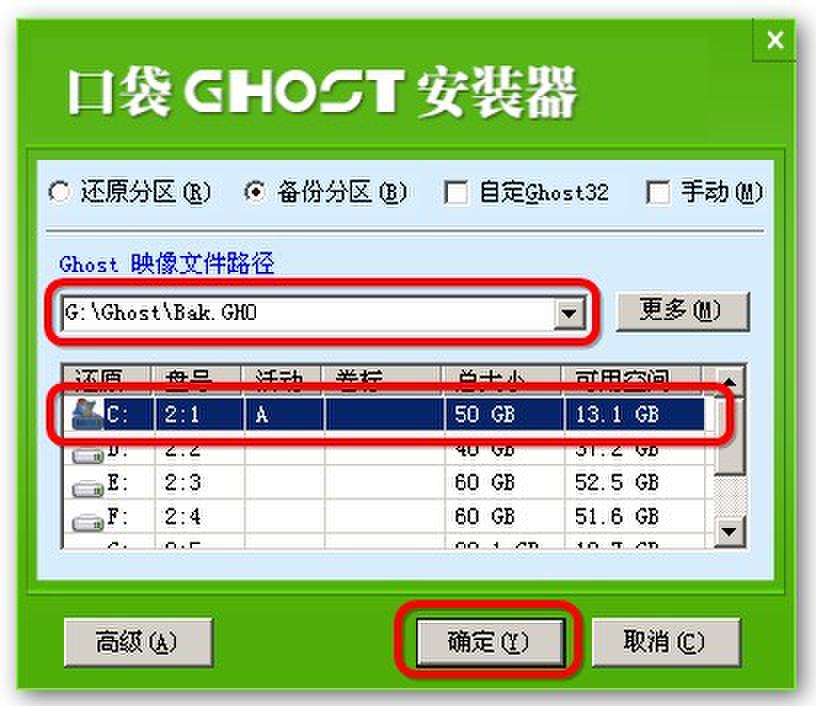 5.在口袋ghost安装器打开后,我们选择备份分区功能,选择要备份的分区和备份路径。一般来说备份系统选择C盘即可。然后选择备份路径,我们这里选择的是备份到G:\Ghost这个文件夹。备份磁盘分区和路径选择完毕后点击确定即可。如图四