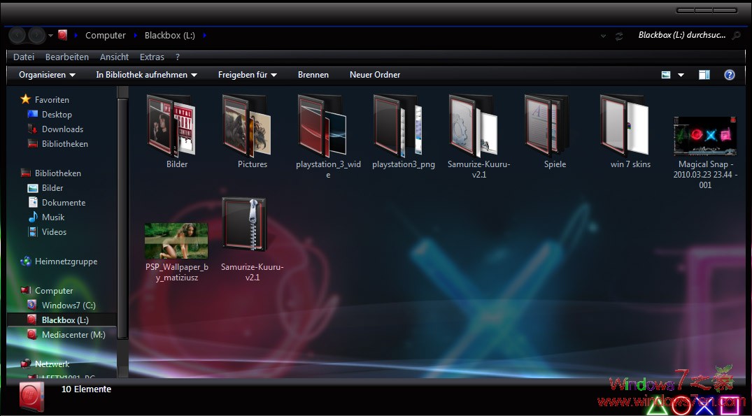 Windows7超炫黑色PS3主题喜欢黑色风格必备by~lefty28请先破解主题限制:http://bbs.windows7en.com/thread-22705-1-1.html已破解的请飘过^^主题下载:http://bbs.windows7en.com/thread-86322-1-1.html