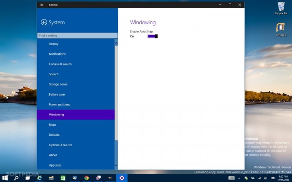 在最新曝光的版本号为9901的Windows10系统中,用户能够通过PC Setting屏幕简单启动,首先跳转到“系统”页面,点击“Windowing”,然后其中一个选项称之为“Enable Areo Snap”,通过简单的点击能够开启或者关闭。