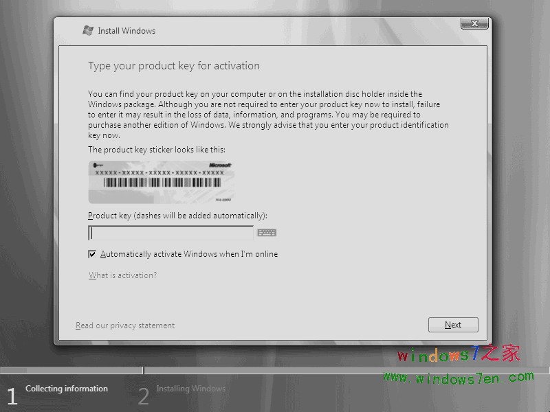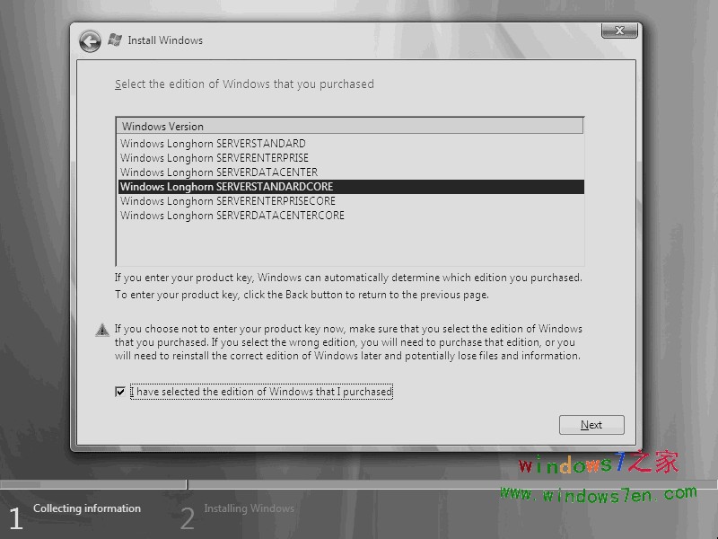 输入“产品密钥”,许可协议,废话当然接受。当然您也可以不在这里输入“产品密钥”,而直接点击下一步,这时会出现一个警告,点击“否”即可。然后在出现的列表中选择你所拥有的密钥代表的版本,同时把下面的复选框的勾打上。