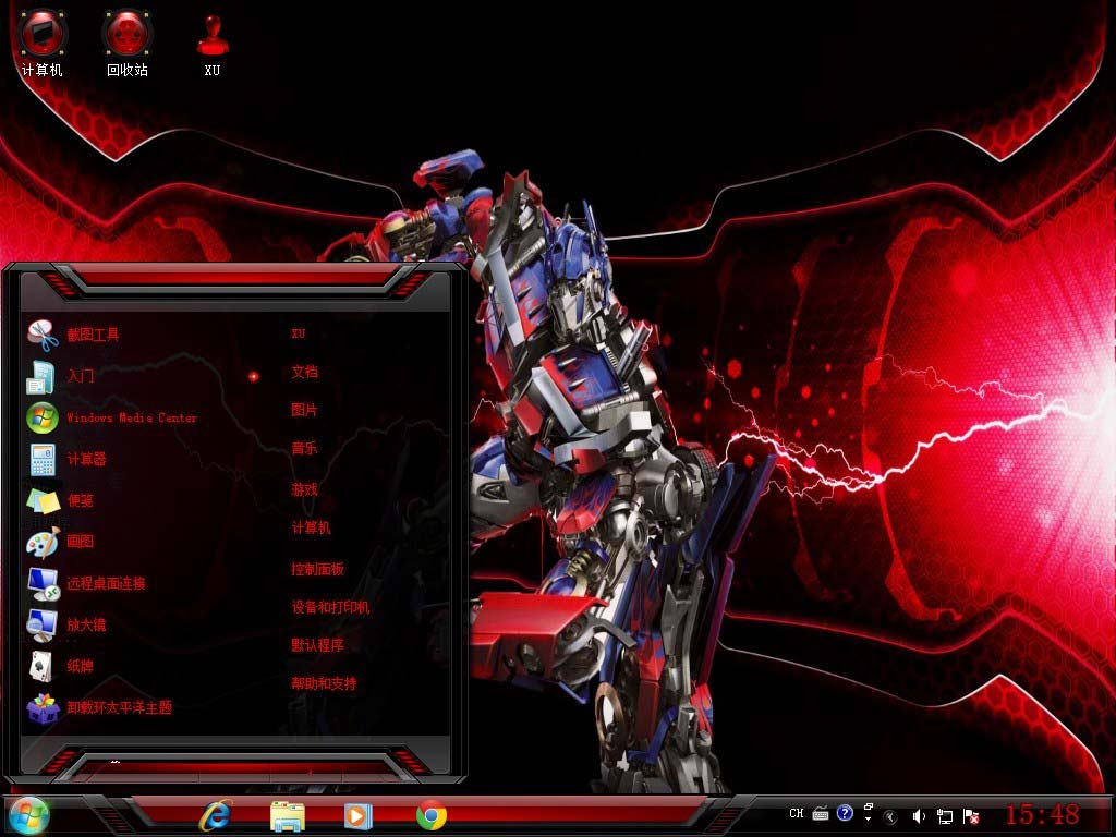 这是小编精心为大家制作的变形金刚主题,怎么样,是不是感觉非常酷。主题以鲜艳的红色为主,菜单中的边框采用漂亮的直角设计,显得非常有机械感,总之这是一款非常棒的Windows7电脑主题。