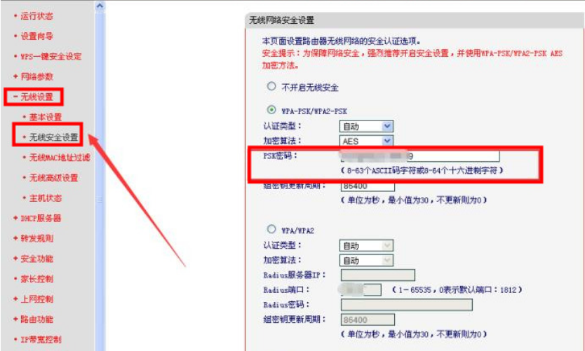 4、弹出窗口左侧找到“无线设置”里的“无线安全设置”选项,右侧找到“PSK密码”重新输入密码即可修改;