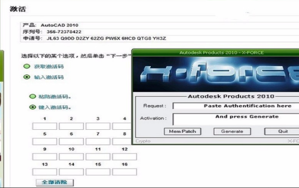 3、鼠标点击注册机的mem patch键,将CAD弹出界面内的注册码复制到request那一行,点击generate,耐心等待注册机生成一行激活码。