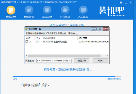 6、在电脑的pe界面中打开装机吧工具,则继续进行系统的安装,等待前进条走完进入引导修复。