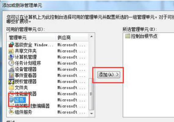 3、在弹出的窗口左侧列表中选中“证书”在点击“添加”。